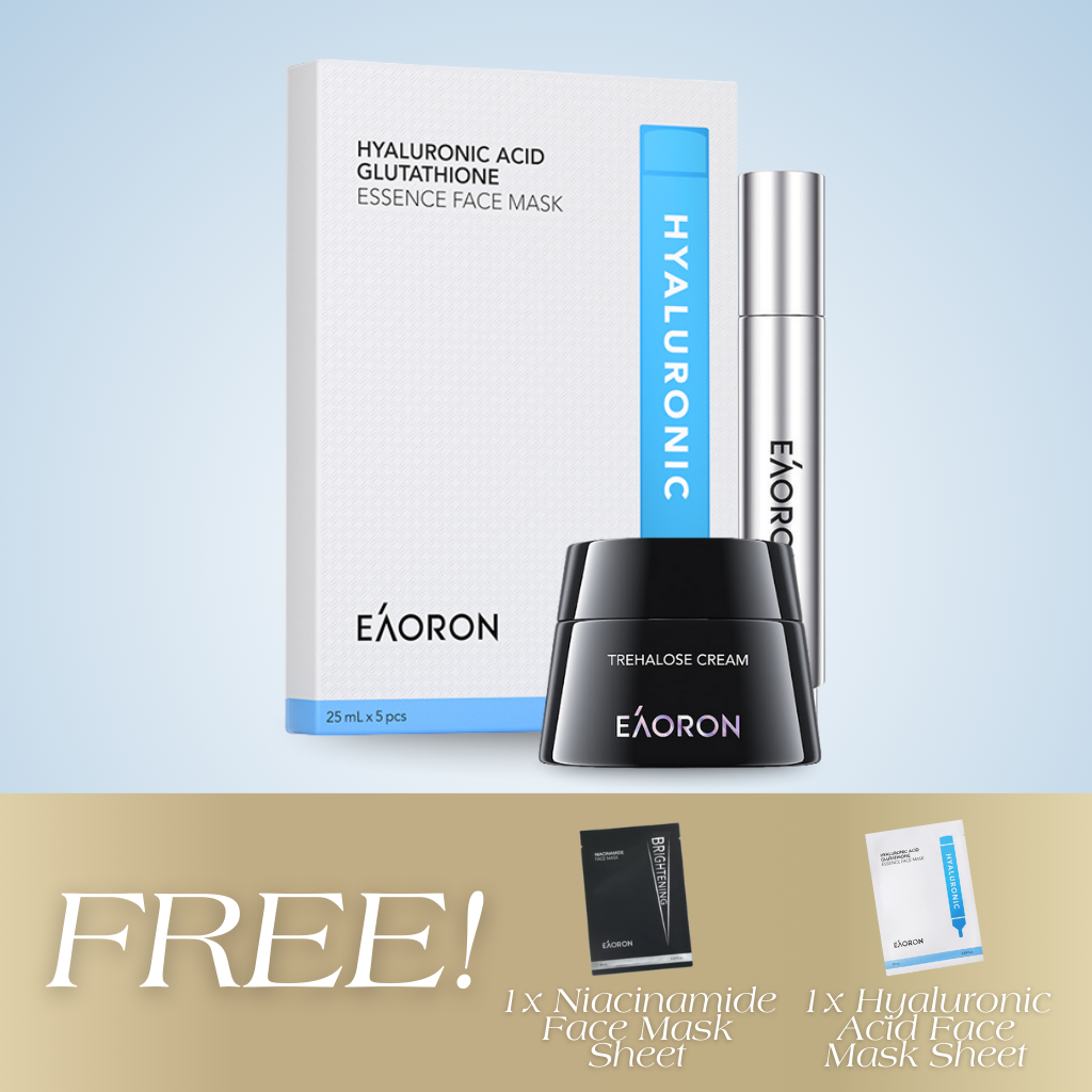 Daily application of Trehalose Cream and Hyaluronic Acid Glutathione Essence. Enhance with Hyaluronic Glutathione Essence Face Mask twice a week. Use All-time Anti-wrinkle Essence for targeted treatment.